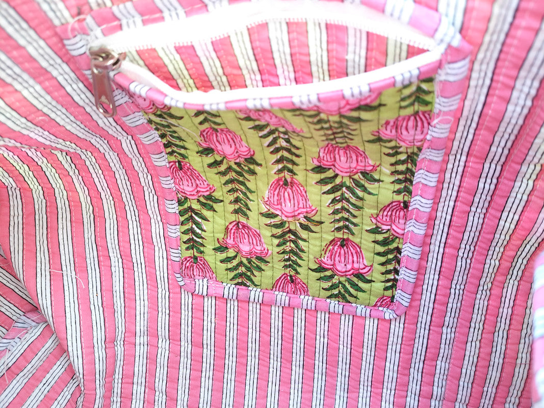 • Eco Commitment: Each bag showcases unique hand-printed cotton fabrics, thoughtfully patched and quilted to promote a lifestyle away from single-use plastics. We ship the bag flat-packed to minimize packaging waste and reduce our carbon footprint.