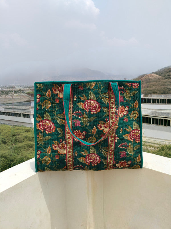 Quilted cotton handprinted reversible large floral patch work stripe tote bag eco friendly Sturdy Grocery Shopping Artist Boho - 31