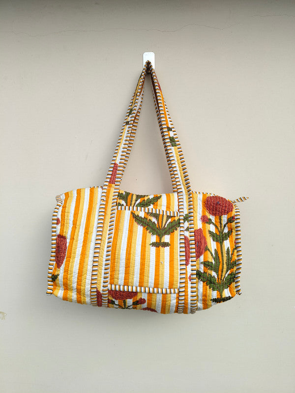Quilted Duffle Tote Shoulder Patch Bag Cotton Handprint Floral Eco friendly Sustainable bag, Yoga Shopping Beach Artist Boho Weekend bag - 1