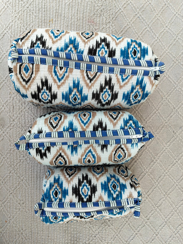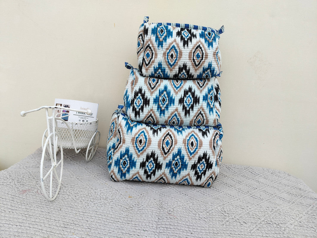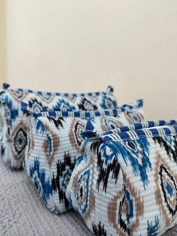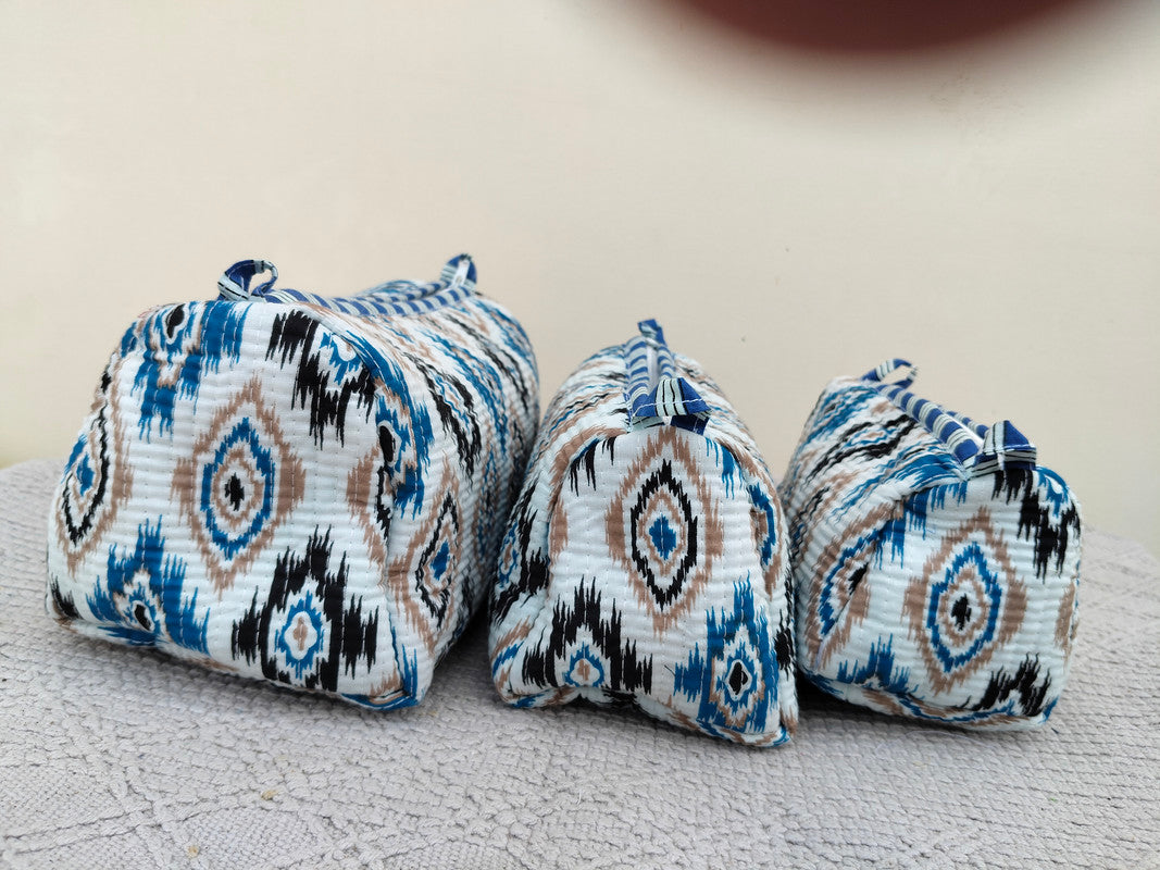 • This Beautiful Hand Block Printed Quilted Cotton Cosmetic Bag Set is the perfect combination of style and function. Crafted with intricate vertical stitching on the exterior, each bag features a durable zipper closure and a waterproof inner plastic lining—ideal for keeping your essentials safe and organized on the go.