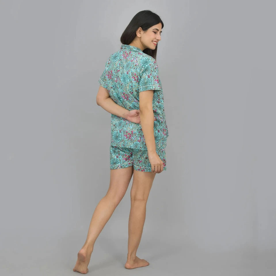 100% Pure Cotton Women's Floral Print Shorts Night Suit Set - Green Hand Block Printed Sleepwear