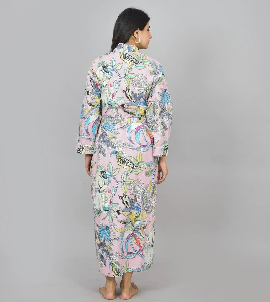 Floral Print Cotton Kimono Robe, Animal Print Pure Cotton Dressing Gown, Block Print Monkey Robe