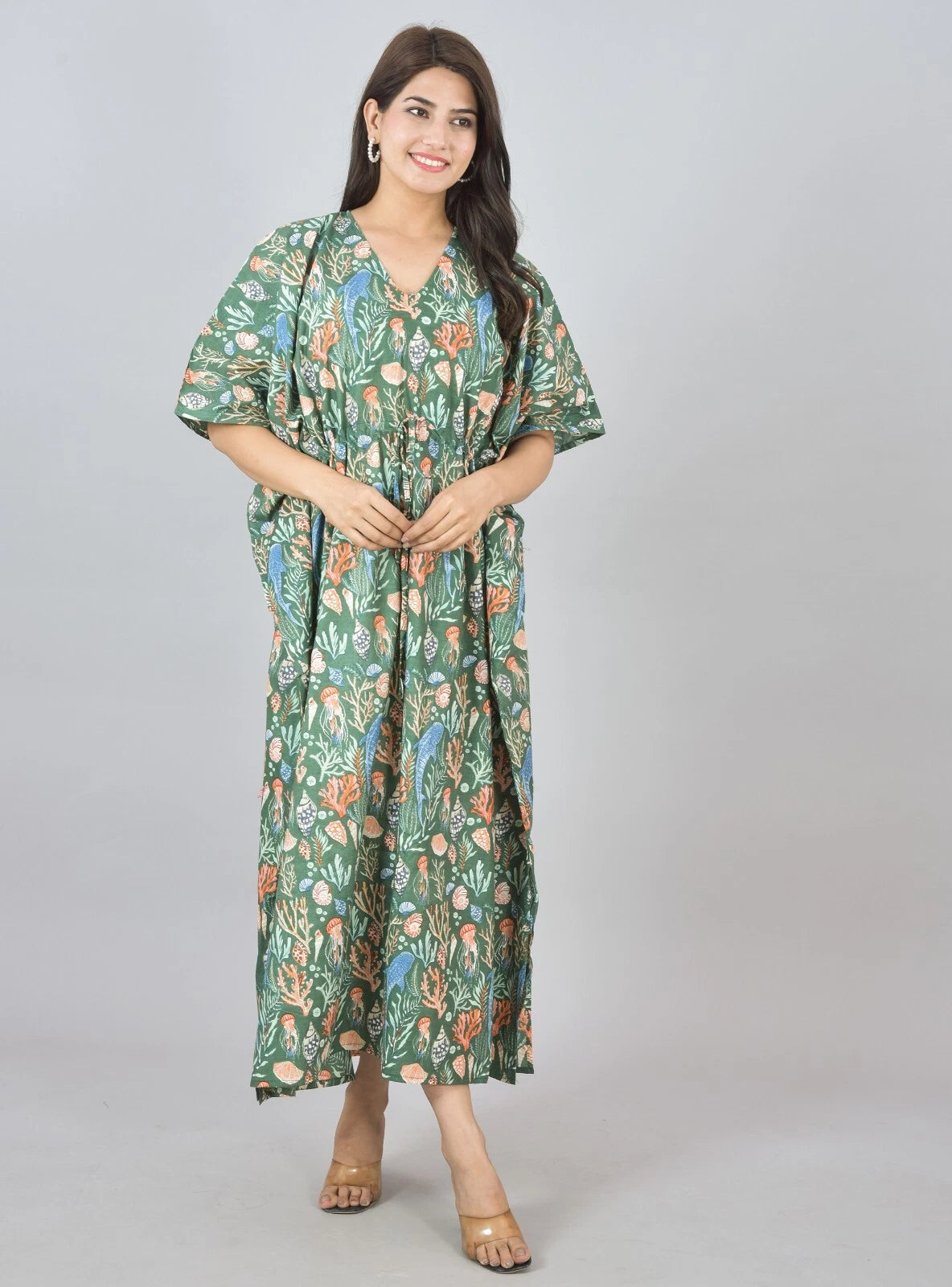 Green Sea Floral Print Cotton Kaftan with Pocket - Women's Beach Cover Up & Summer Loungewear