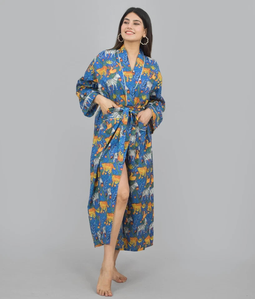 Print Cotton Kimono Robe Dressing Gown | Animal Print 100% Cotton Kimono Robe | Block Print Bridesmaid Robe Collection